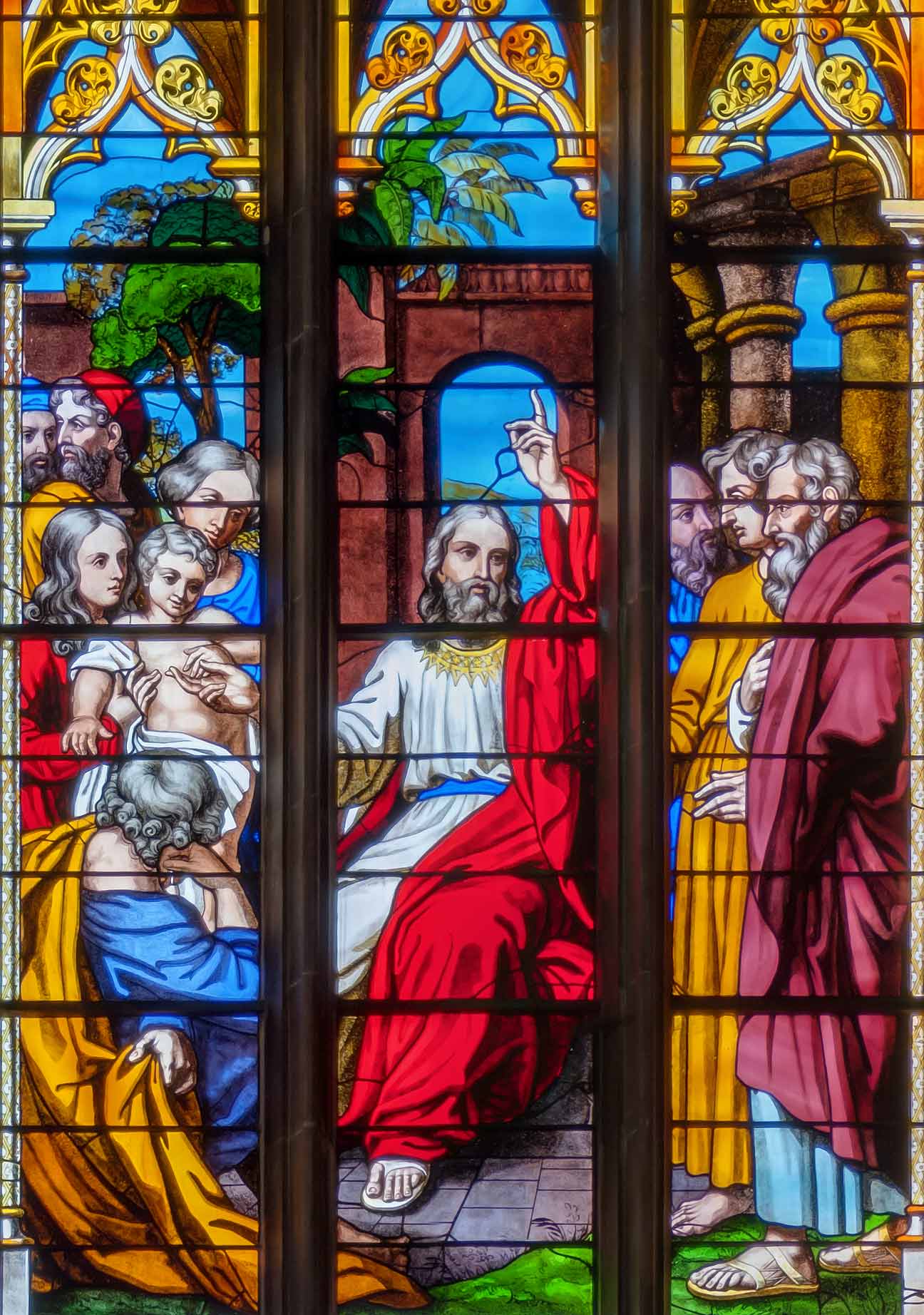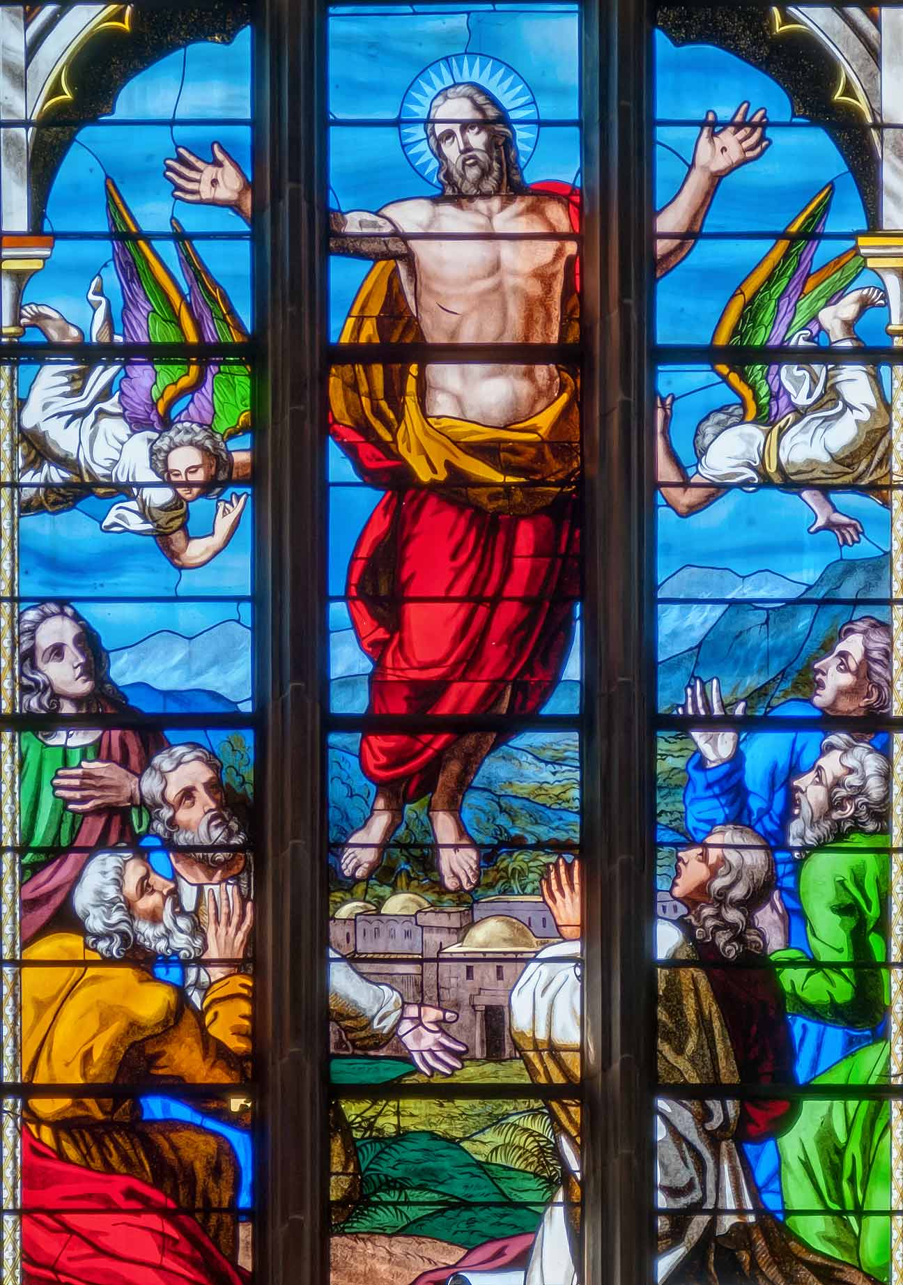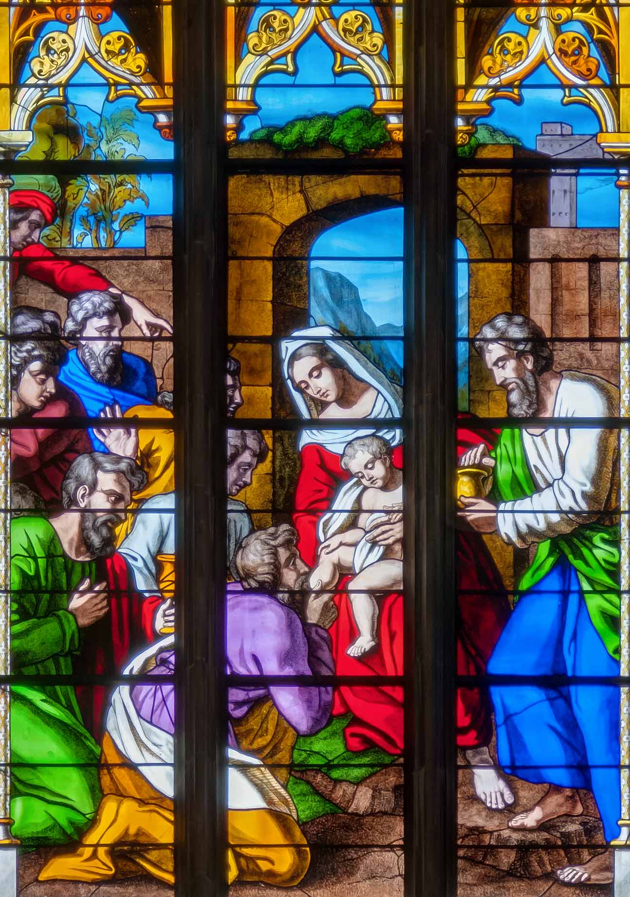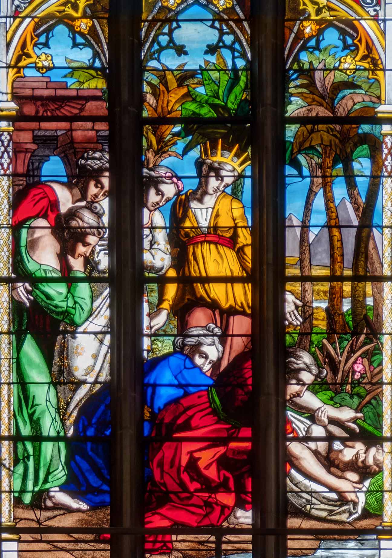 Of the six main panels of the window the three upper ones depict scenes from the New Testament. The lower panels depict scenes from the Old Testament.