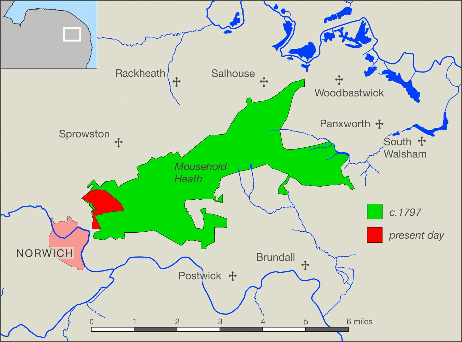 In Tudor times Mousehold Heath was much different in area to that of the heath of today. It extended six miles eastward from its present boundary, almost to South Walsham, with a perimeter of some twenty-two miles, and was common land on which the inhabitants of the adjacent villages could graze their animals and grow their crops, free from interference from the lords of the manors.