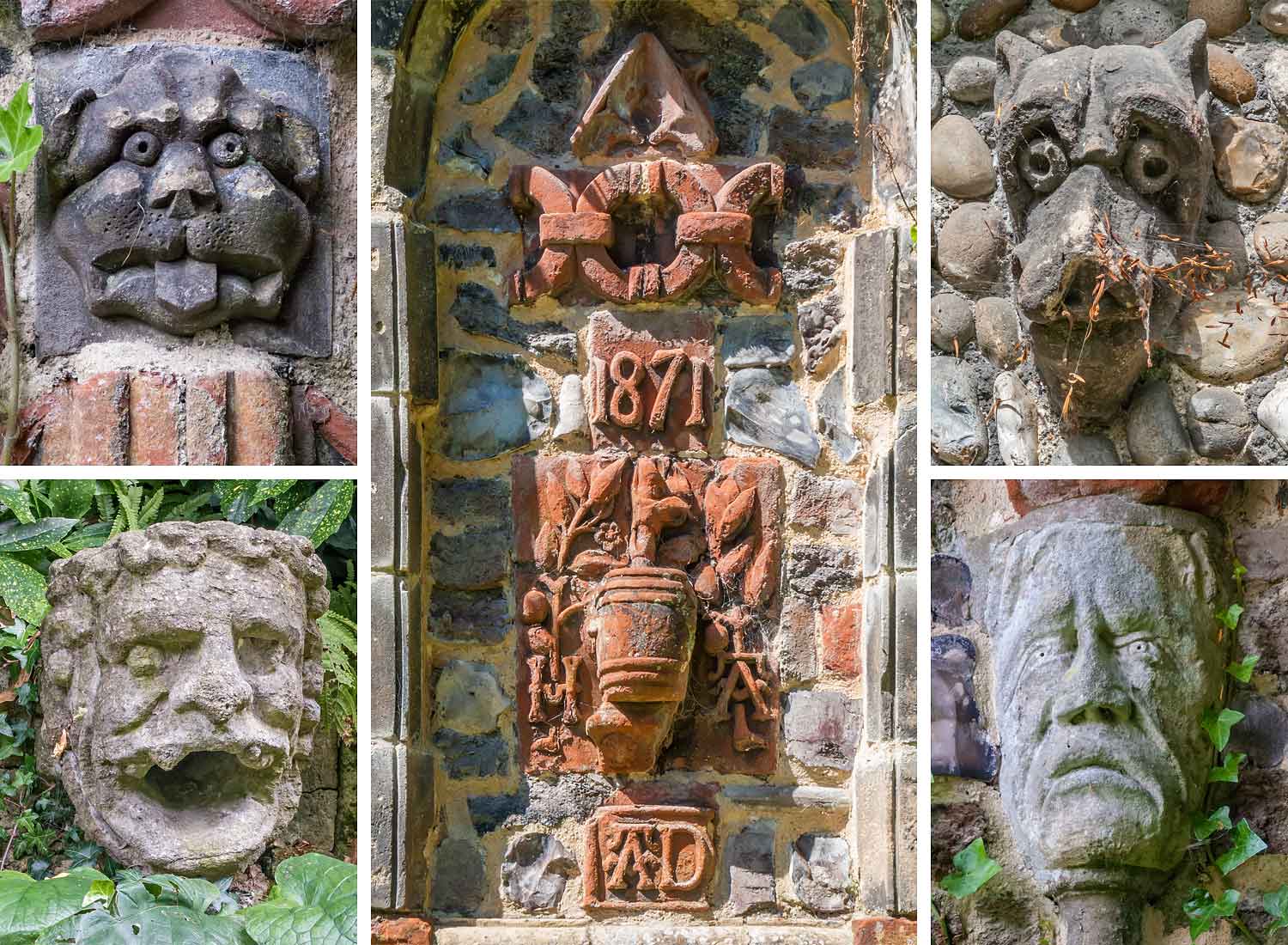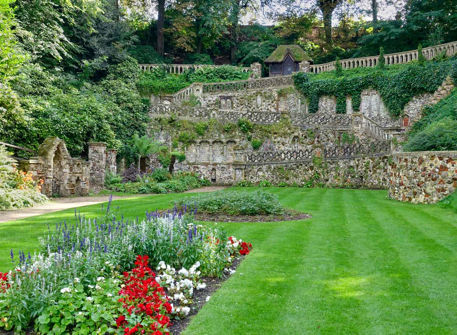 Grade II listed, the Plantation Garden is almost three acres in area and features at one end a rustic bridge and at the other a terrace reminiscent of those to be found in the gardens of Rennaissance Italy. Both offer fine views looking down into the garden. In between are the splendid Gothic fountain, beautifully manicured lawns and flower beds, and a number of follies, including a Gothic alcove, a church window and a ‘medieval’ wall full of interesting patterns and designs. Paths at different levels on the steep banks to either side afford views of the garden and offer woodland walkways to explore. Display panels around the garden inform the visitor about the garden, its creator and its history.