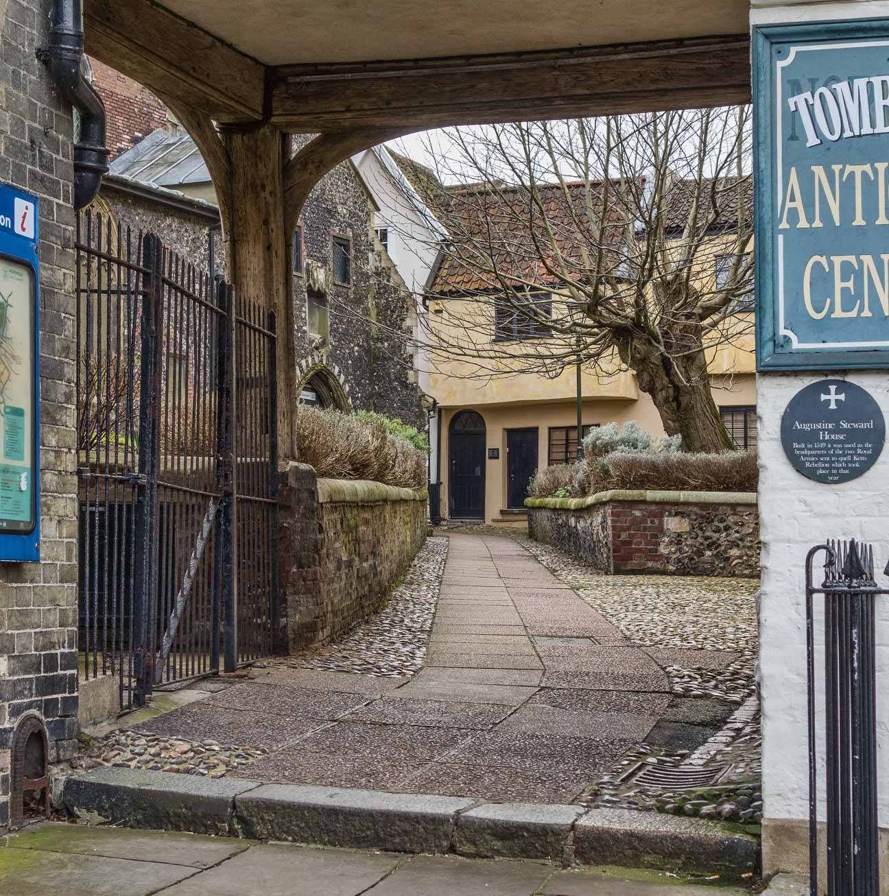 On its north side Tombland Alley is bounded by the timber framed Augustine Steward House, which dates from 1549 and possibly earlier. Augustine Steward (1491-1571) was a wealthy merchant, an MP and three times mayor of Norwich. At his invitation the house was used as headquarters for the Earl of Warwick's army during the suppression in 1549 of Kett's Rebellion, a revolt against the enclosure of common land by wealthy landowners, which left peasants with nowhere to graze their animals.
